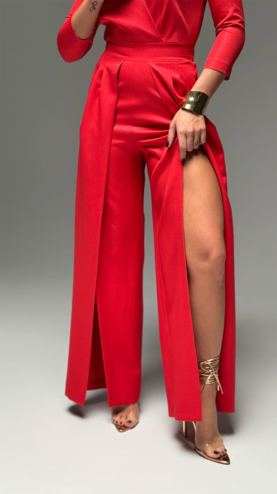 Представляем вам комбинезон, который сочетает в себе комфорт и безупречный стиль. Главные акценты модели — это эффектный запах в области декольте, который красиво обрамляет зону груди и создает соблазнительный V-образный вырез. Практичный рукав длиной три четверти (чуть ниже локтя) придает силуэту изящество и открывает запястья, визуально делая руки более тонкими. Широкие брюки дополнены модными разрезами по переду, которые добавляют образу легкости и позволяют продемонстрировать обувь при ходьбе. Особое внимание уделено посадке на талии. Сзади в пояс аккуратно вставлены небольшие отрезки широкой резинки, которые обеспечивают идеальное прилегание по фигуре и комфорт при движении.