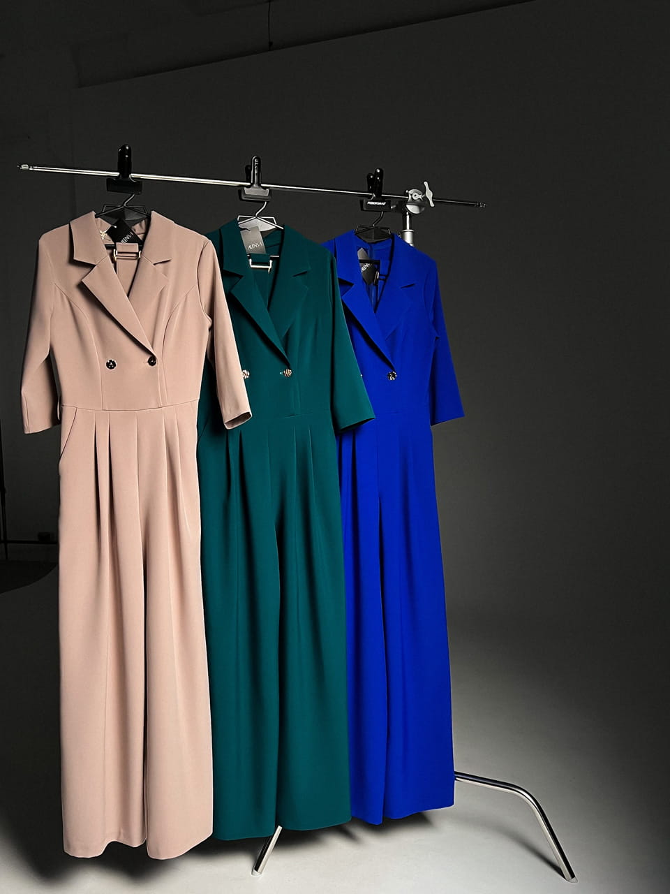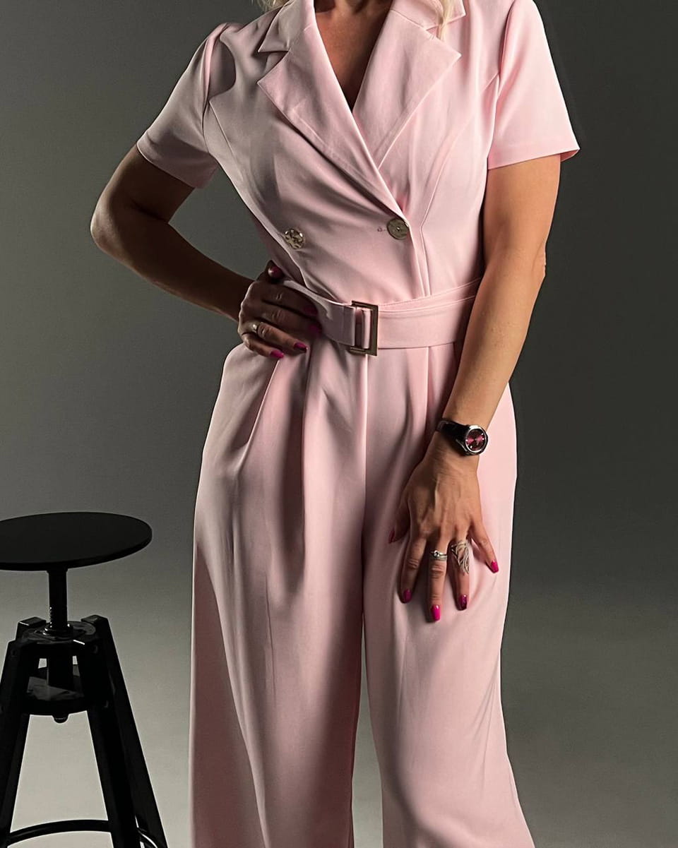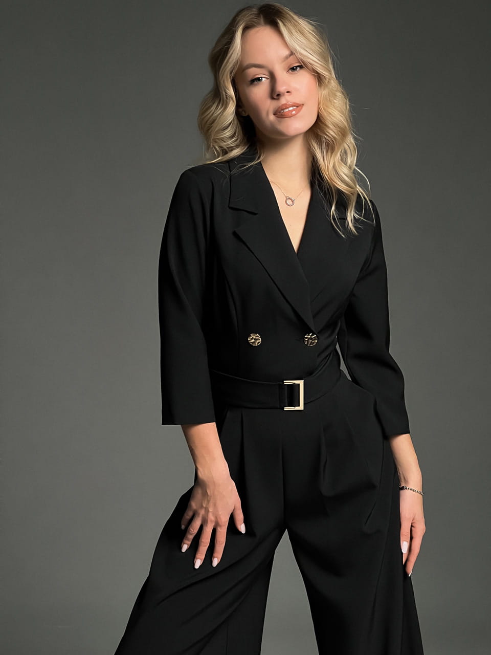 Эффектный комбинезон в деловом стиле . Выполнен в виде двубортного жакета с запахом, украшен золотыми металлическими пуговицами. Идеальный выбор для работы в офисе с дресс-кодом и для деловых мероприятий. Рукав длиной три четверти придает силуэту легкость и изящество, открывая запястья и визуально удлиняя руки. Главная конструктивная особенность — потайная молния сзади. Такое решение позволяет сохранить идеально ровную, графичную линию переда без лишних швов и фурнитуры. Завершающий акцент — пояс с золотой пряжкой в тон пуговицам, который подчеркивает талию и придает образу завершенность. Брюки классического кроя длиной в пол создают идеальную вертикаль, вытягивая силуэт.